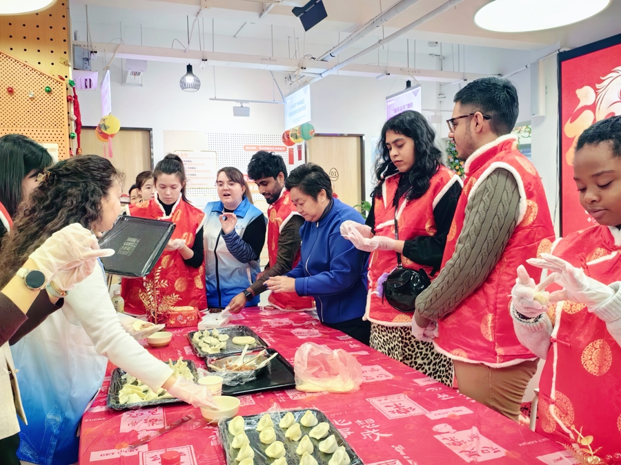 蛇年的临了一个中午,徐家汇街说念徐虹北党群行状中心里东说念主头攒动,一群穿戴大红色唐装的年青东说念主用中、英、法、韩、意等列国讲话浓烈通常。他们有的在写对联和福字,有的在包饺子,还有的在玩投壶、猜文虎。当桌上铺满春卷、饺子、熏鱼、白斩鸡等特质菜和点心,巨匠又轮替上台饰演节目,让这顿极度“大除夜饭”的敌视达到了高涨。这些肤色、讲话互异的年青东说念主便是徐家汇街说念“国外益行团”的志愿者们,受邀来党群中心过中国春节,他们中有几个擅长中语的留学生还不忘施行,穿上蓝色的志愿者马甲,为巨匠担任翻译,把行动现场酿成了一个莫得国界的家。