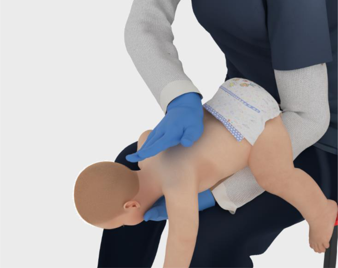 若异物仍未排出,此时将孩子夹住翻转,用掌根按压胸部5次,类似以上行为。