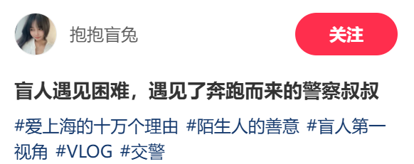 博主在视频收尾说,失明之后,好多声息变得厉害,但那天辅警的哨声、脚步声,还有那句“我带你去”,是她这一年听到最温情的声息。一个路口,
