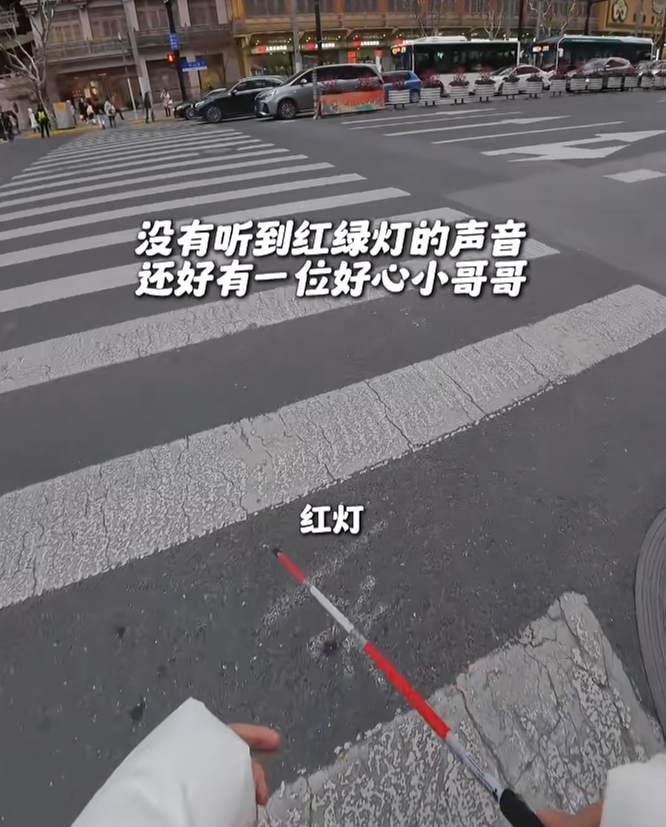 1月29日下昼,在静安区愚园路华山路口博主“抱抱盲兔”约一又友在建行门口见面,但站在路口,看不见信号灯,也辨不清标的,几次尝试随东谈主流穿行齐未到手。